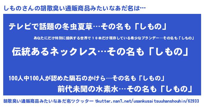 | 意味不明あだ名 | 『とにかく怪しいしもの』『自称しもの』 |