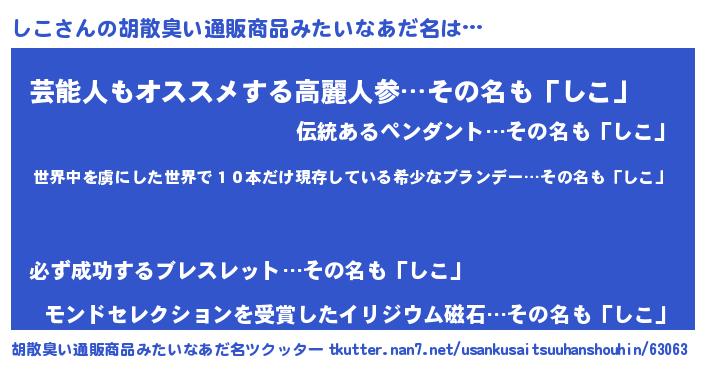 | 意味不明あだ名 | 『住所不定無職しこ(81歳)』『自称しこ』 |