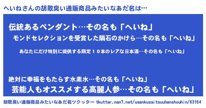 | 意味不明あだ名 | 『住所不定無職へいね(50歳)』『自称へいね』 |