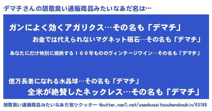 | 意味不明あだ名 | 『住所不定無職デマチ(4歳)』『自称デマチ』 |