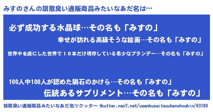 | 男性向けラノベタイトル風あだ名 | 『はたらくみすのさま!』『みすのの憂鬱』 |