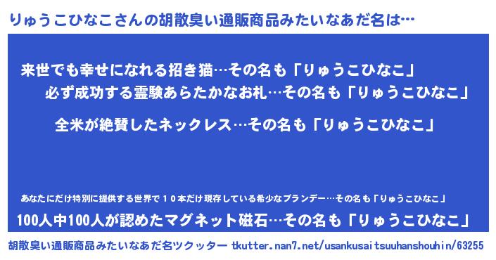 | 男性向けラノベタイトル風あだ名 | 『りゅうこひなこの嫁は女の子じゃないと思った?』 |