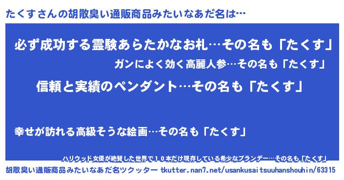 | 意味不明あだ名 | 『とにかく怪しいたくす』『自称たくす』 |