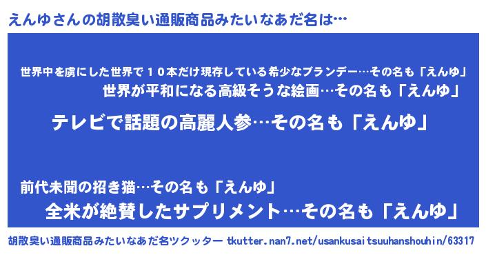 | 意味不明あだ名 | 『自称えんゆ』『住所不定無職えんゆ(84歳)』 |