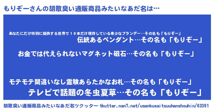 | 男性向けラノベタイトル風あだ名 | 『もりぞーに滅ぼされるだけの簡単なお仕事です』 |