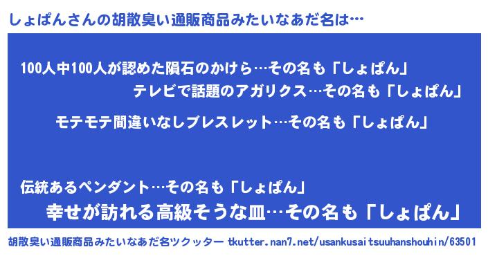 | 男性向けラノベタイトル風あだ名 | 『転生したらしょぱんだった件』 |
