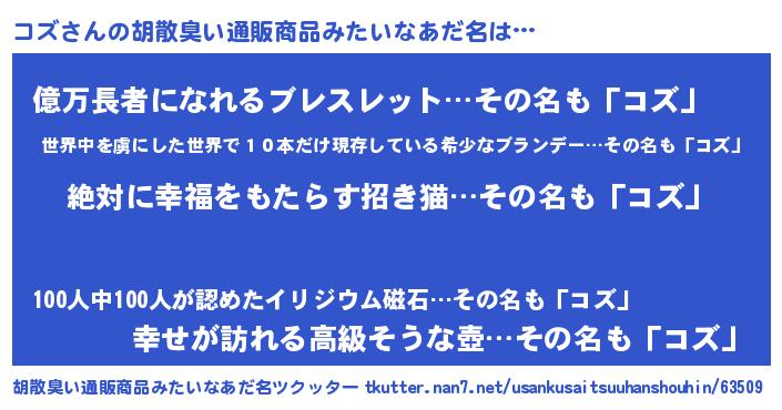 | 男性向けラノベタイトル風あだ名 | 『コズという概念が存在しない退屈な世界 』 |
