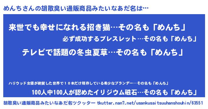 | ヘコむあだ名 | 『めんち(震え声)』『めんにゅー』 |