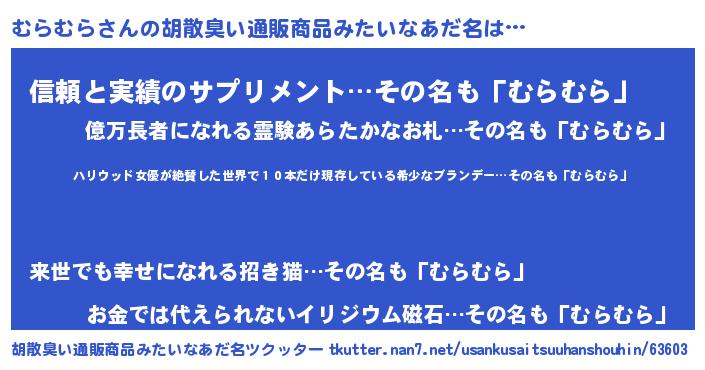 | 意味不明あだ名 | 『住所不定無職むらむら(85歳)』 |