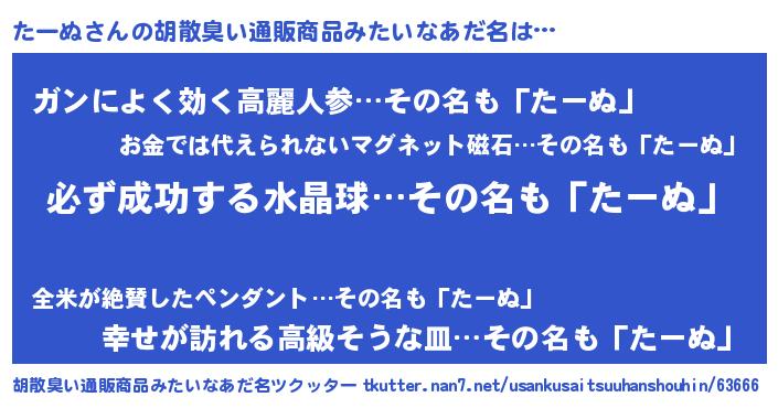 | 男性向けラノベタイトル風あだ名 | 『緋弾のターヌ』『はたらくたーぬさま!』 |