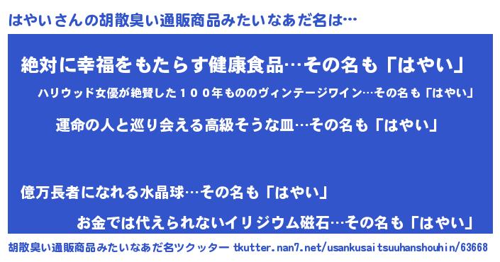 | ファンタジー風あだ名 | 『エターナルハヤイー』『ハヤディッシュ』 |