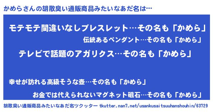 | 料理風あだ名 | 『ヘルシー!かめらのピリ辛酒蒸し!』 |