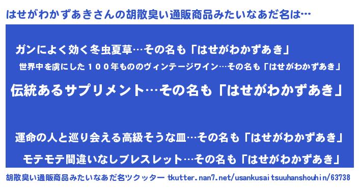 | 女子向けラノベタイトル風あだ名 | 『はせがわかずあきの卵を拾いまして』 |