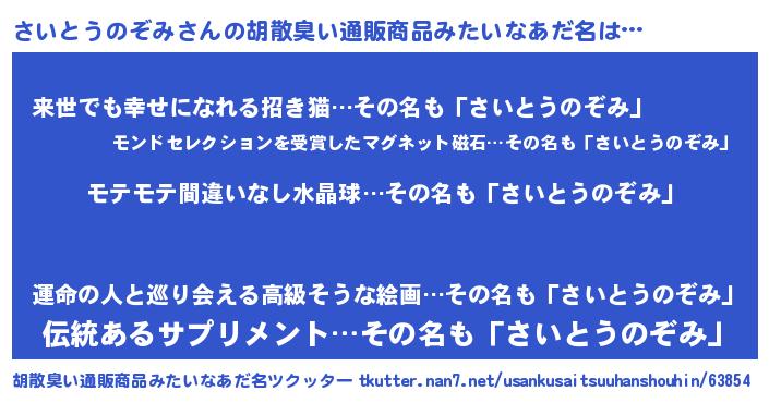 | ヘコむあだ名 | 『さいにゅー』『さいとうのぞみ(爆)』 |