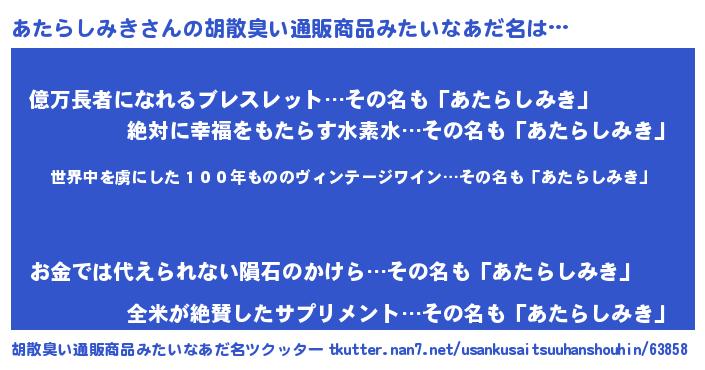 | 恥ずかしいあだ名 | 『プリティーあたらしみき』『あたちん』 |