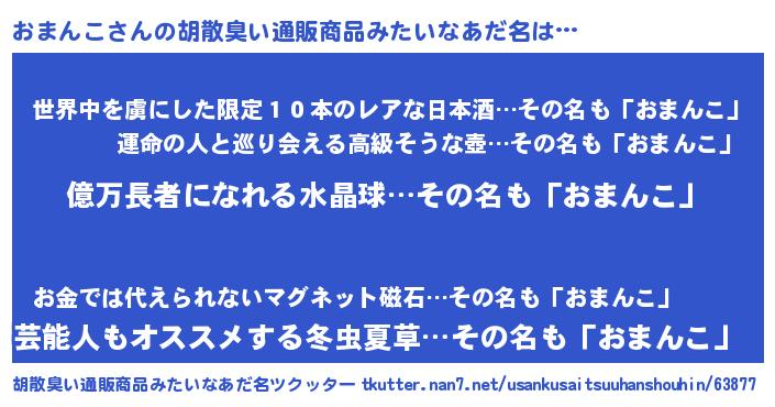 | 男性向けラノベタイトル風あだ名 | 『おまんこ~年齢イコール彼女いない歴の魔法使い~』 |