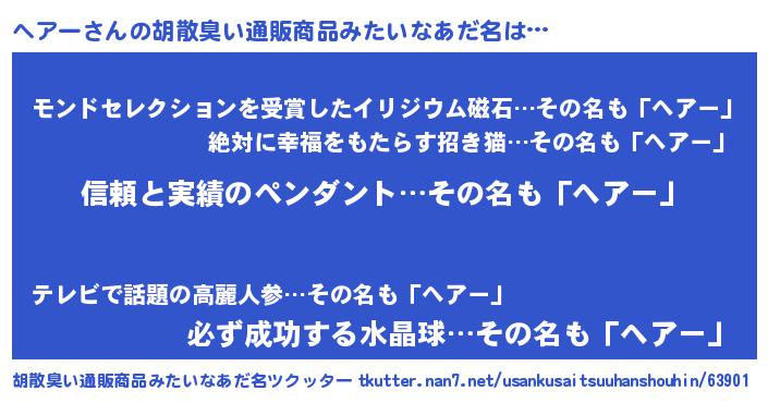 | ヒーロー風カッコイイあだ名 | 『魔戒騎士ヘア』『天空の使者ヘアー』 |