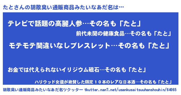 | 男性向けラノベタイトル風あだ名 | 『転生したらたとだった件』『たとの憂鬱』 |