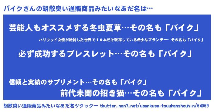 | 男性向けラノベタイトル風あだ名 | 『バイクの憂鬱』 |