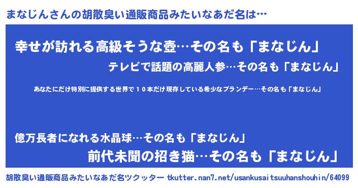 | 意味不明あだ名 | 『住所不定無職まなじん(77歳)』 |