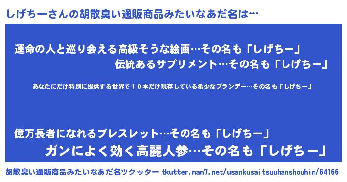 | 意味不明あだ名 | 『住所不定無職しげちー(89歳)』 |
