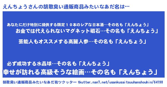 | ヘコむあだ名 | 『酢こんぶ』『えんもー』『えんっぺ』 |