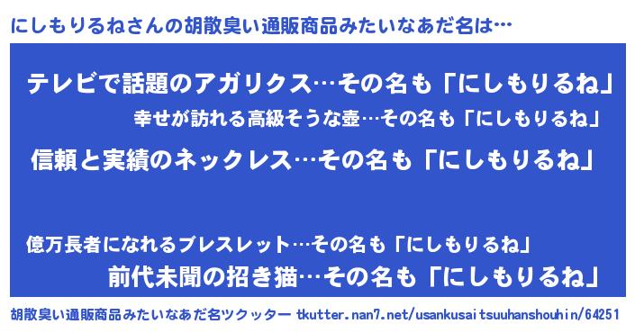 | 意味不明あだ名 | 『とにかく怪しいにしもりるね』 |