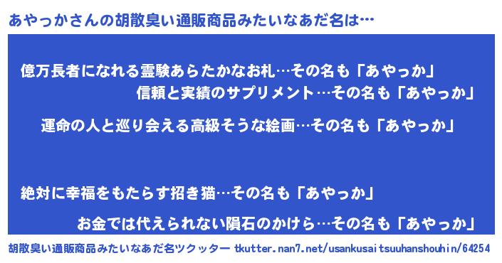 | 男性向けラノベタイトル風あだ名 | 『あやっかに滅ぼされるだけの簡単なお仕事です』 |