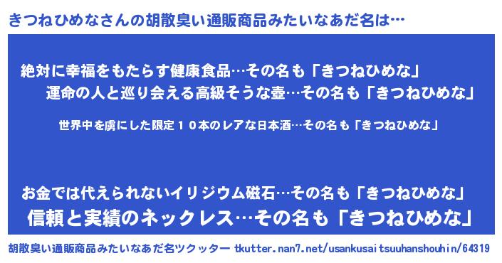 | 意味不明あだ名 | 『住所不定無職きつねひめな(62歳)』 |
