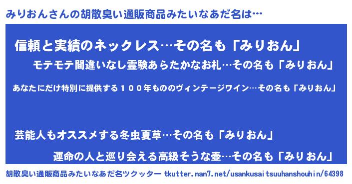 | 意味不明あだ名 | 『住所不定無職みりおん(9歳)』 |