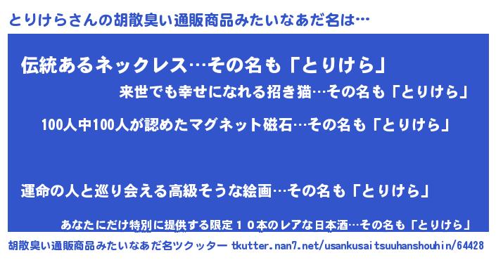 | 男性向けラノベタイトル風あだ名 | 『おまえをオタクにしてやるから、俺をとりけらにしてくれ! 』 |