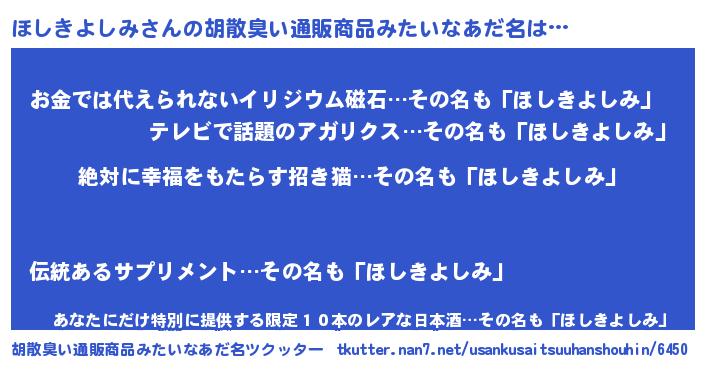 | ヘコむあだ名 | 『ほしきよしみ(笑)』『ほし太郎』 |