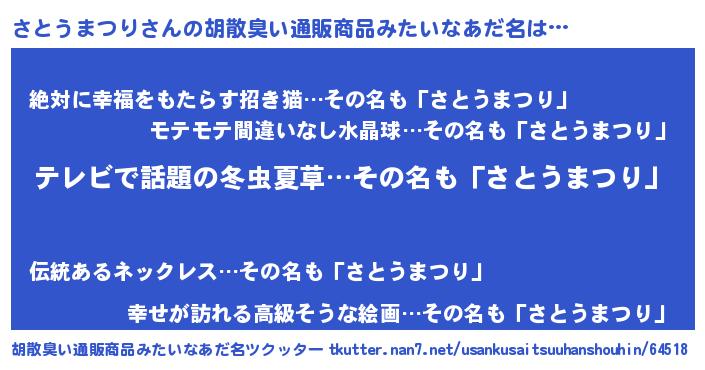 | 男性向けラノベタイトル風あだ名 | 『転生したらさとうまつりだった件』 |