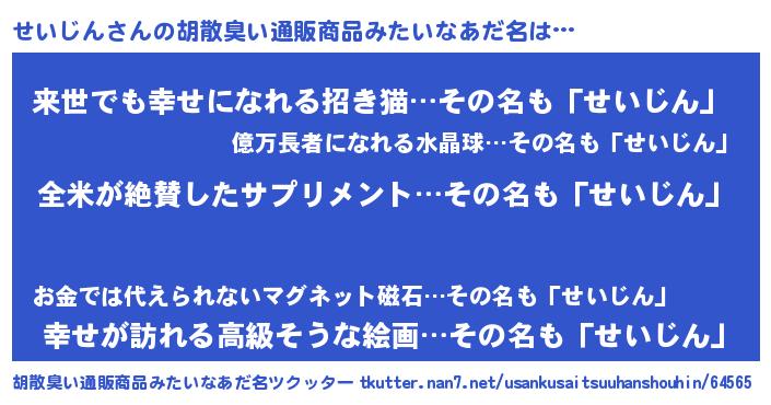 | 男性向けラノベタイトル風あだ名 | 『せいじん~年齢イコール彼女いない歴の魔法使い~』 |