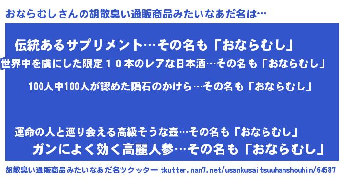 | 男性向けラノベタイトル風あだ名 | 『おまえをオタクにしてやるから、俺をおならむしにしてくれ! 』 |