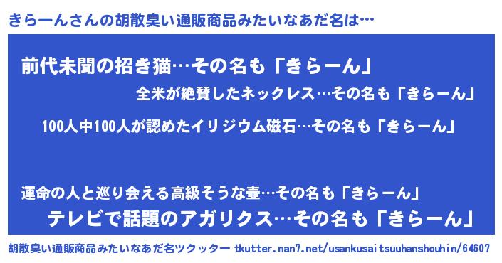 | ヘコむあだ名 | 『きらーん(爆)』『きらお』『つくし』 |