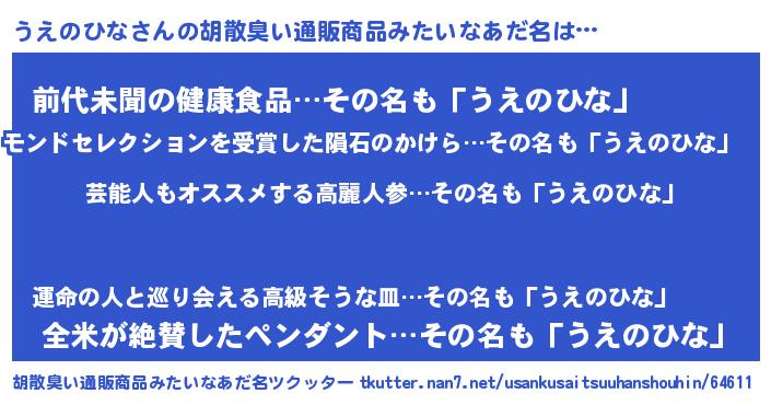 | 意味不明あだ名 | 『自称うえのひな』『永久保存うえのひな』 |
