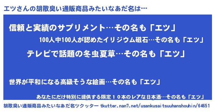 | 意味不明あだ名 | 『自称エツ』『とにかく怪しいエツ』 |