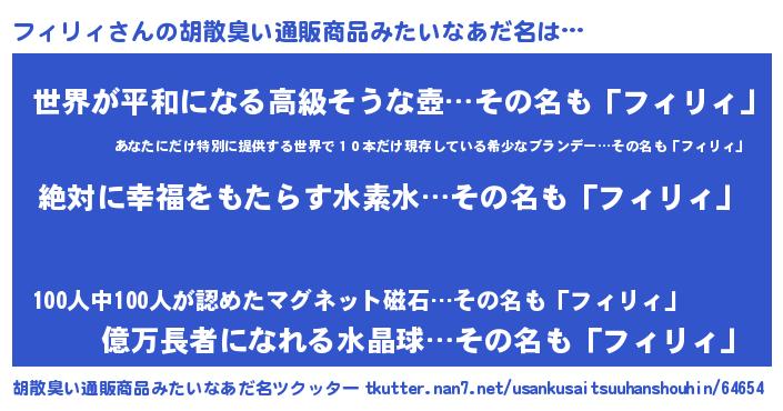 | 男性向けラノベタイトル風あだ名 | 『フィリィという概念が存在しない退屈な世界 』 |