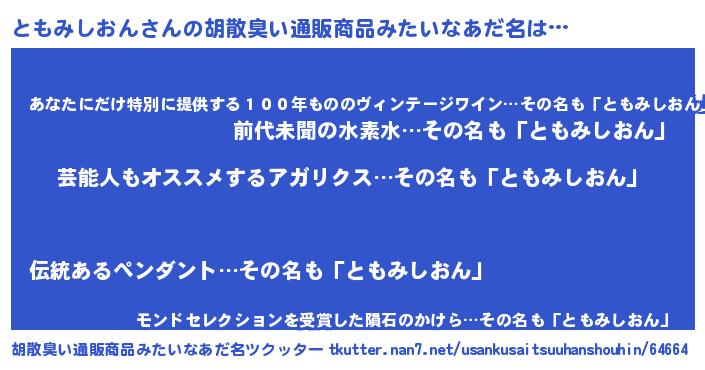 | 男性向けラノベタイトル風あだ名 | 『ともみしおん~年齢イコール彼女いない歴の魔法使い~』 |