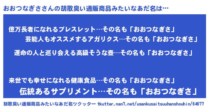 | 男性向けラノベタイトル風あだ名 | 『おおつなぎさ~年齢イコール彼女いない歴の魔法使い~』 |