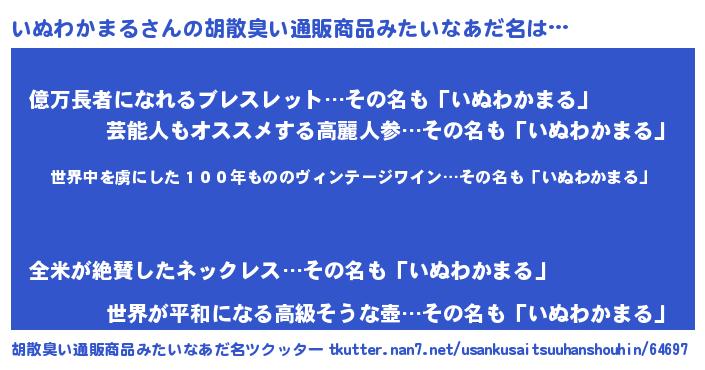 | 男性向けラノベタイトル風あだ名 | 『この素晴らしい世界にいぬわかまるを!』 |