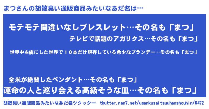 | 意味不明あだ名 | 『住所不定無職まつ(91歳)』『ペロリンまつ』 |