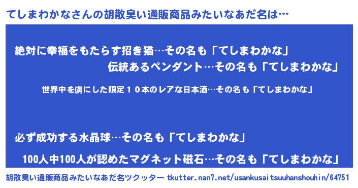 | 意味不明あだ名 | 『住所不定無職てしまわかな(56歳)』 |