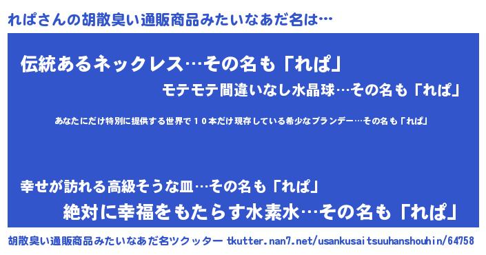 | 男性向けラノベタイトル風あだ名 | 『この素晴らしい世界にれぱを!』 |