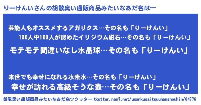 | 意味不明あだ名 | 『ペロリンりーけんい』『自称りーけんい』 |
