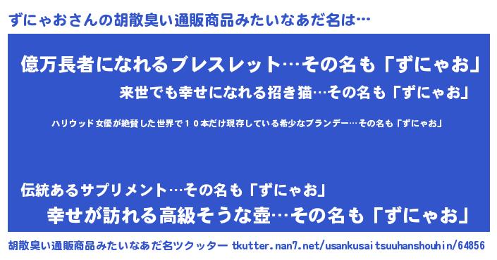 | 男性向けラノベタイトル風あだ名 | 『魔弾の王とずにゃお』『ずにゃおの憂鬱』 |