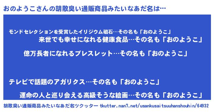 | 意味不明あだ名 | 『ペロリンおのようこ』『自称おのようこ』 |