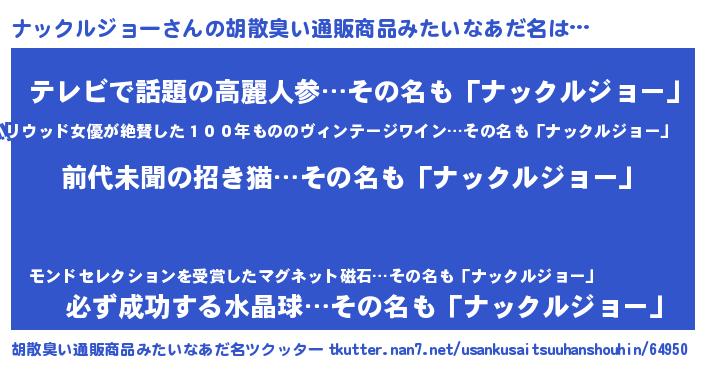 | 意味不明あだ名 | 『永久保存ナックルジョー』 |