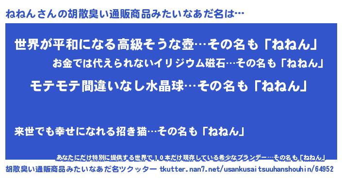 | 男性向けラノベタイトル風あだ名 | 『ねねんの憂鬱』『魔弾の王とねねん』 |